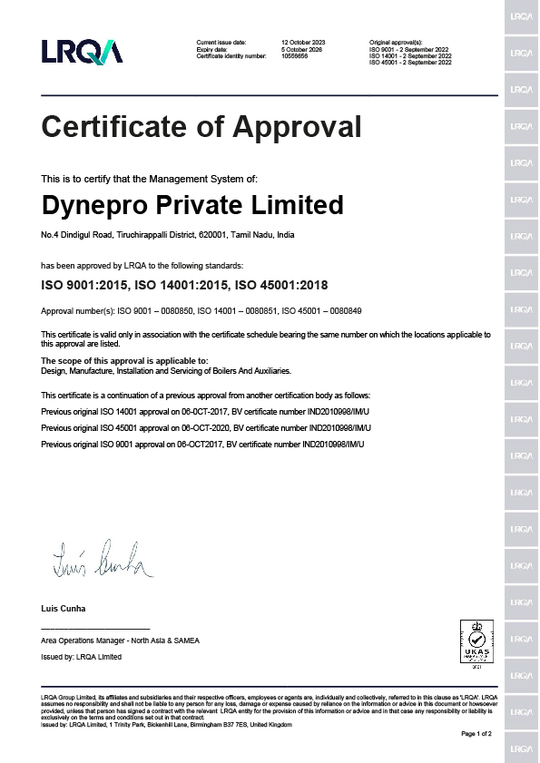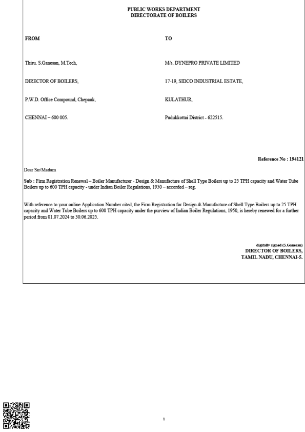 DPL has Firm approval from Director of Boilers / Tamil Nadu to (i)manufacture Boiler pressure part components (ii) to erect and repair of boilers.